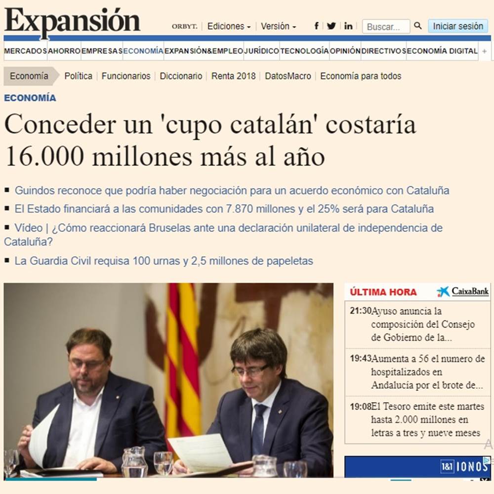 Artículo del diario Expansión, (poco sospechoso de ser independentista) sobre el dinero que España obtiene en neto de Cataluña:
